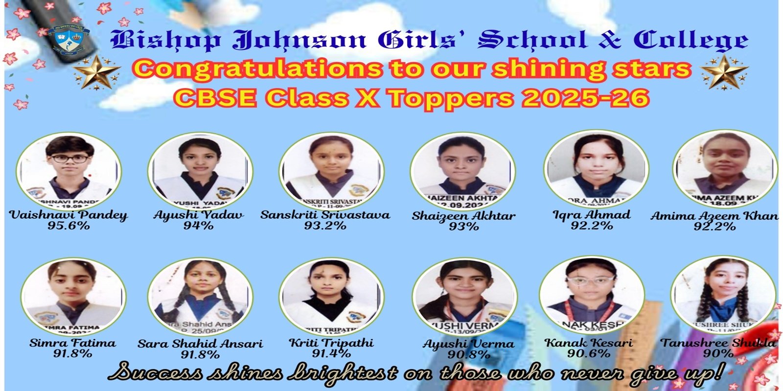 At Bishop Johnson Girls’ School & College, excellence is a tradition. Our Toppers of 2024–25 have demonstrated remarkable dedication, discipline, and determination. Their outstanding performance reflects not only academic brilliance but also the strong values and guidance imparted by our institution.